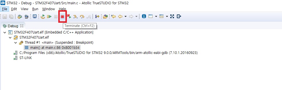 [Run] 메뉴에서 [Debug Configurations...]을 클릭하여 다음의 그림과 같이 설정한 후에, 맨 아래의 [Debug] 버튼을 누릅니다. [Debug] 버튼을 누르면 실행파일이 STM32F407로 다운로드 된 후에 디버깅 모드로 들어 갑니다. [Run] 메뉴의 [Terminate]를 클릭하거나 툴박스의 [Terminate] 아이콘을 누르면 디버그 모드가 종료됩니다. 이후로는 [Run] 메뉴의 [Debug]를 클릭하면 바로 다운로드 및 디버깅이 시작됩니다.