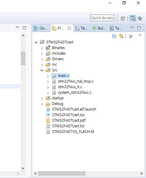 ⑤ [Project Explorer] 창에서 [Src] 폴더 안에 있는 [main.c]를 더블 클릭하여 엽니다.