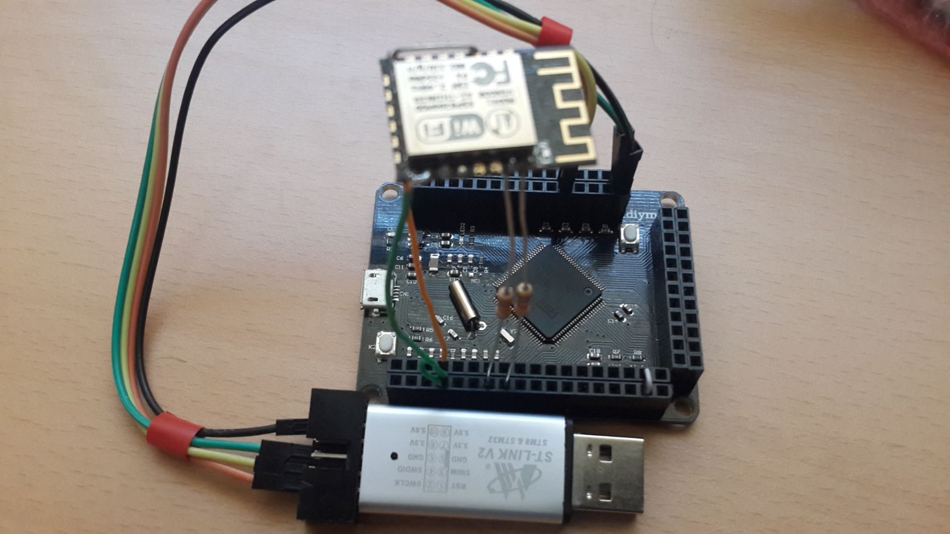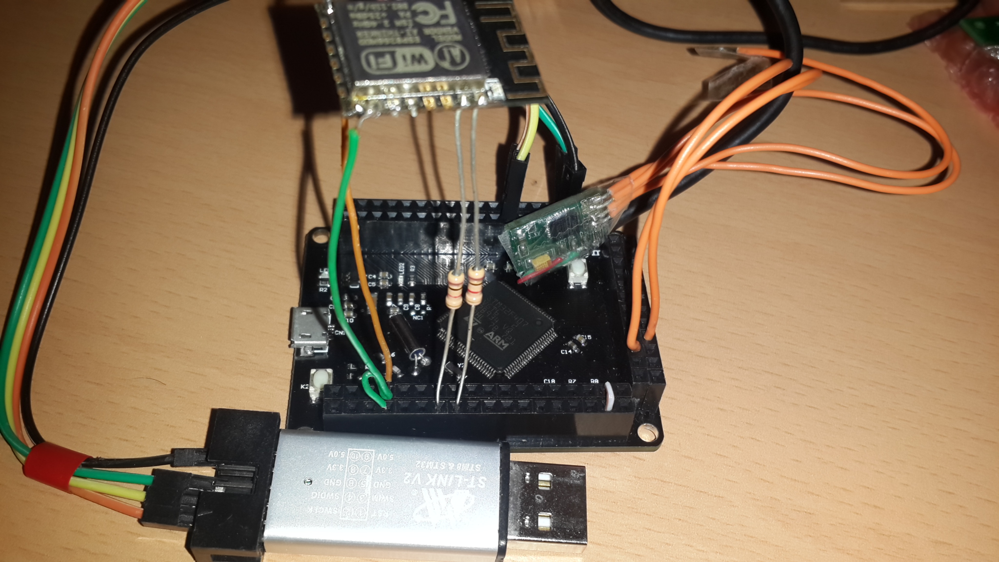 PC와 시리얼 통신을 하기 위해서 STM32F407의 USART3에 USB-TTL 장치를 연결합니다. 가급적 배선을 줄이려고 USB-TTL의 전원선인 Vcc와 GND는 연결하지 않았습니다. 보드의 전원을 PC의 USB로부터 받기 때문에 전원을 연결하지 않아도 통신이 가능합니다. USB-TTL의 TxD는 STM32F407의 USART3 RxD(PB11), USB-TTL의 RxD는 STM32F407의 USART3 TxD(PB10)에 연결합니다. 다음은 보드에 ST-LINK/V2와 ESP8266-12F, USB-TTL을 연결한 사진입니다.