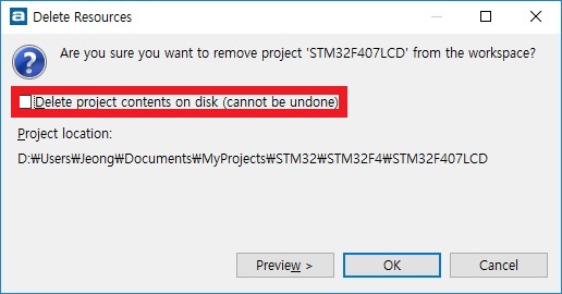 프로젝트를 지울 때에 다음과 같은 팝업 창이 나오는데, 빨간 색으로 표시한 부분을 체크하고 [OK] 버튼을 누르면, 프로젝트가 하드디스크에서도 완전히 지워져서 다시 복구하기 어려워진다는 점에 유의해야 합니다.
