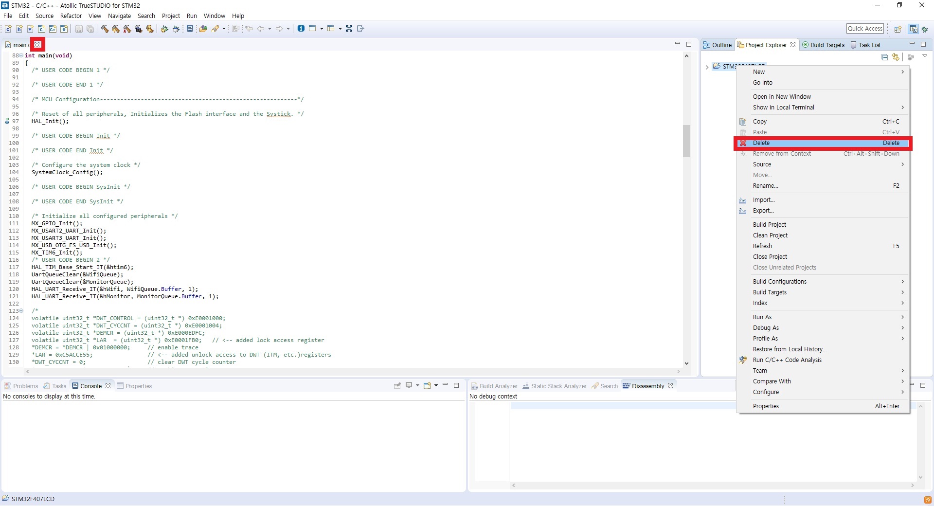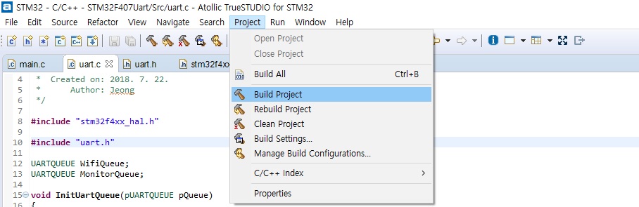 [Project] 메뉴에서 [Build Project]를 클릭하여 실행파일을 만듭니다.