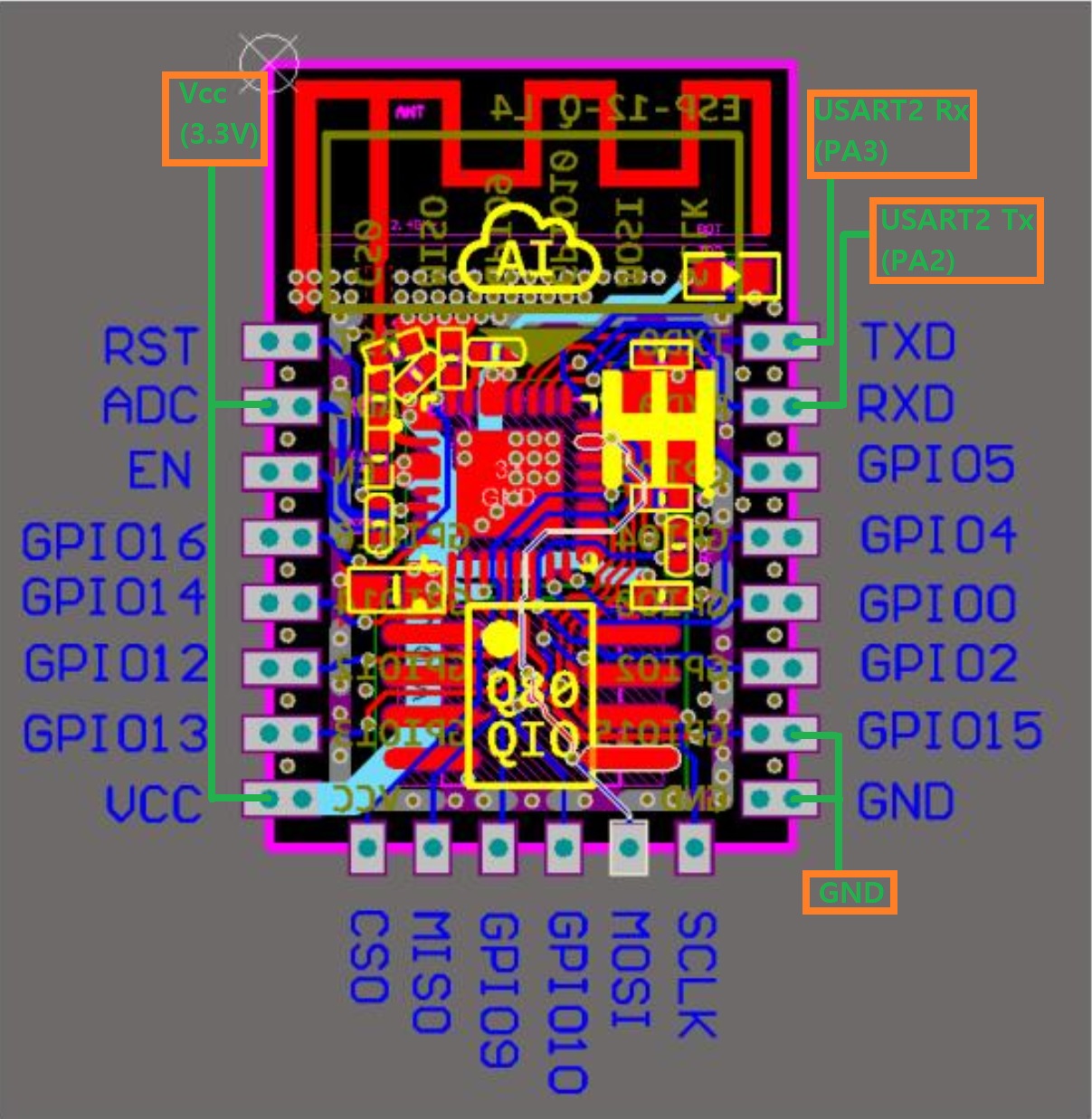본 프로그램에서는 ESP8266-12F를 STM32F407의 USART2에 연결합니다. ESP8266-12F를 시리얼 Wifi로 사용하기 위해서 다음 그림에 녹색으로 표시한 4 곳을 연결합니다.
