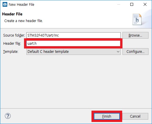 [Header file] 항목에 uart.h를 입력하고 [Finish] 버튼을 누릅니다.