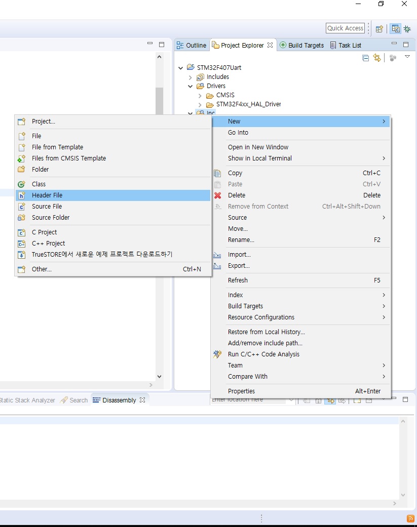 ⑥ uart.h와 uart.c 파일을 프로젝트에 추가합니다. 헤더 파일을 [Inc] 폴더에 추가하기 위해 다음과 같이합니다. [Project Explorer] 창의 [STM32F407Uart] 프로젝트 아래의 [Inc] 폴더를 우측 마우스 버튼으로 클릭한 후에 [New], [Header File]을 클릭합니다.