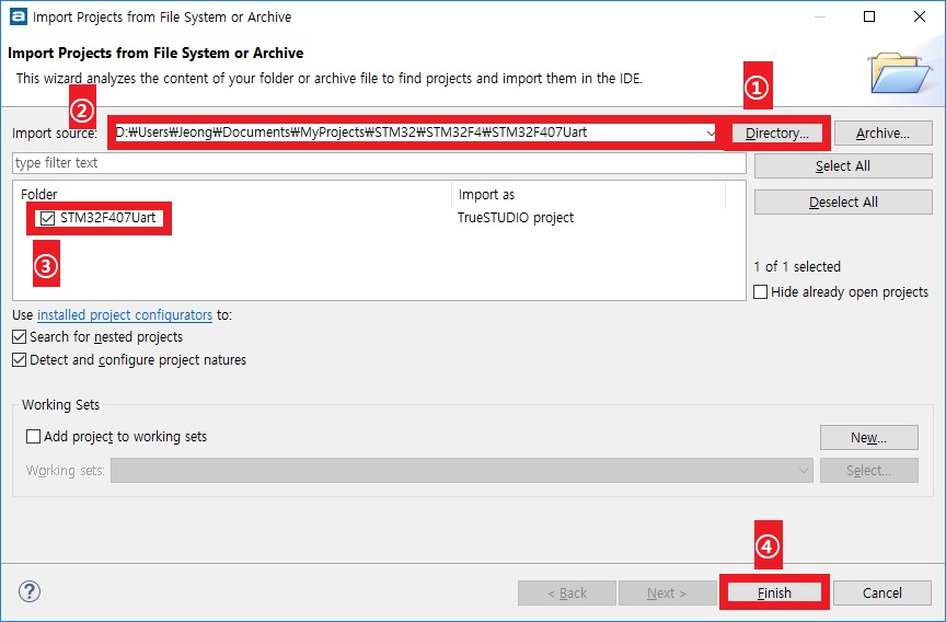④ [Directory...] 버튼을 눌러 앞의 글에서 만든 STM32F407Uart가 있는 폴더를 선택합니다. 필자의 경우는 [D:\Users\Jeong\Documents\MyProjects\STM32\STM32F4\STM32F407Uart] 폴더에 만들었습니다. [Import source]의 항목이 정확하게 선택한 후에, [Folder] 항목에서 STM32F407Uart의 체크 박스를 선택하고, [Finish] 버튼을 클릭합니다.