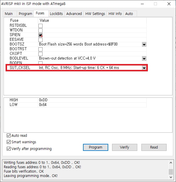 리모콘 신호의 길이는 ATmega8L의 16비트 타이머인 Timer1의 Input Capture 인터럽트를 이용해서 측정하겠습니다. 먼저 ATMega8L이 내부 오실레이터 8MHz로 동작하도록 휴즈비트를 다음 그림과 같이 설정합니다.