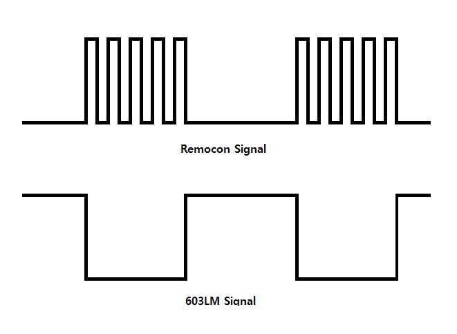 적외선 수신 센서인 603LM에 관하여 간단히 알아 보겠습니다. 대부분의 리모콘은 38KHz의 주파수를 가지는 적외선 신호를 내보냅니다. 603LM은 이 신호를 받아 아래 그림과 같이 출력합니다.