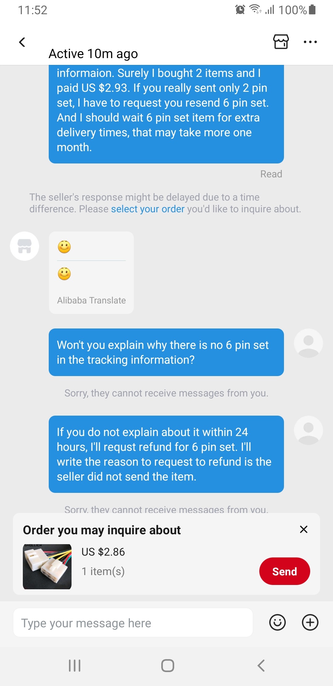 중국 판매자에게 왜 6핀짜리는 배송 정보에 없냐고 문의했습니다. 판매자는 그냥 기다리라는 답변을 하더니만 메시지 수신을 거부해 버리네요.