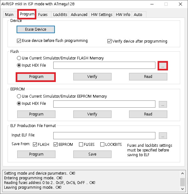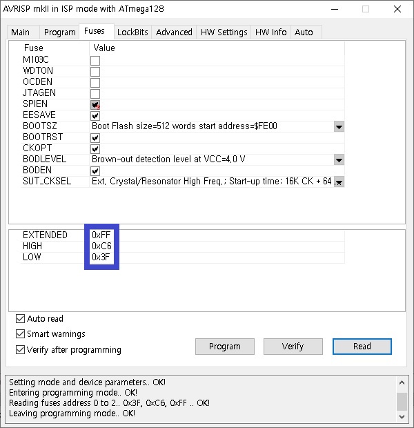 Device로 ATmega128을 선택하고 [Read Signature] 버튼을 눌러서 Signature matches seleted device 메시지가 나오는지 확인합니다.