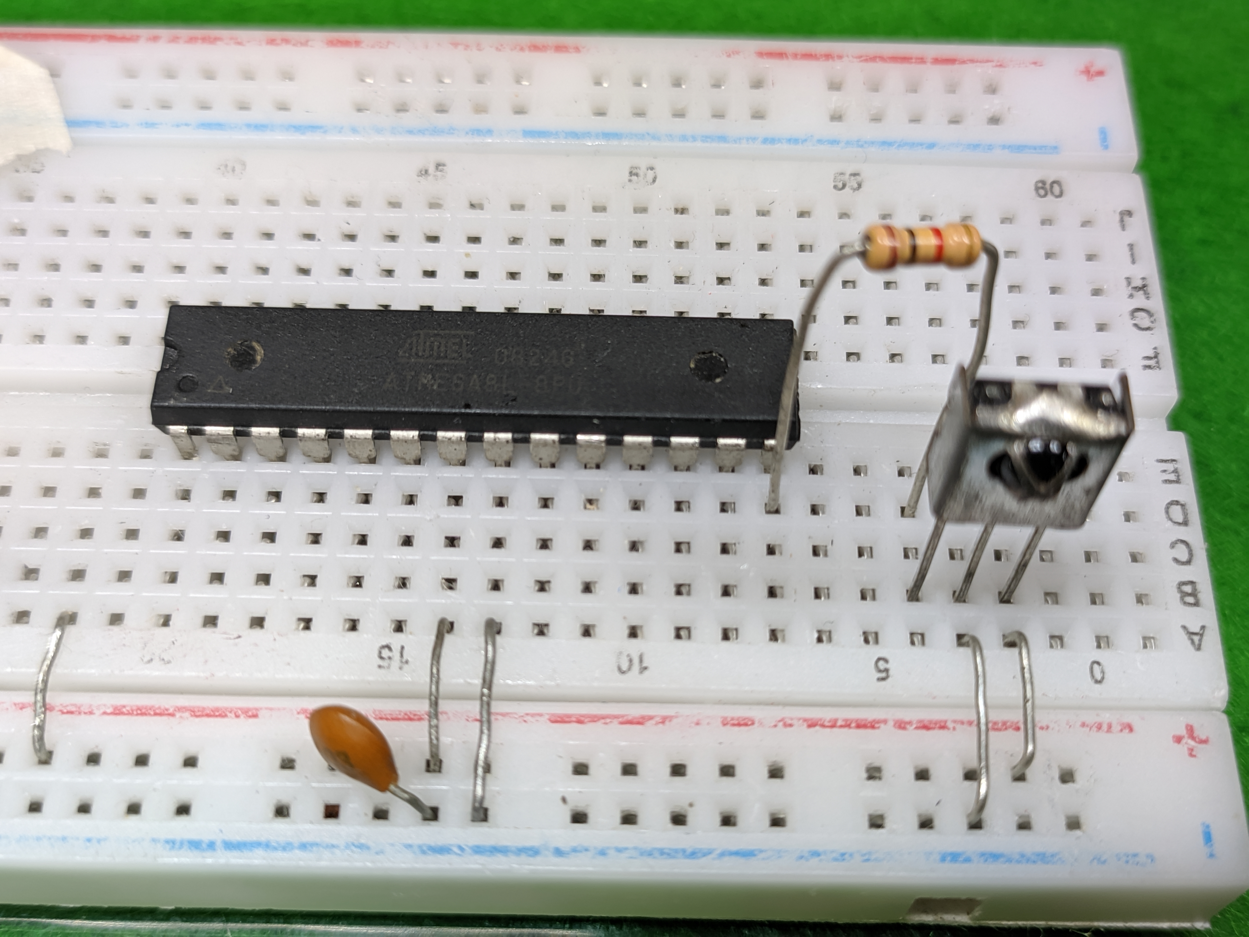 ATmega8L로 적외선 리모콘 코드를 읽어 파형 정보를 출력해 보기로 합니다. 회로를 간단히 하기 위해서 AVR의 내장 8MHz RC Oscillator를 사용하기로 합니다. 필요한 부품은 다음과 같습니다.