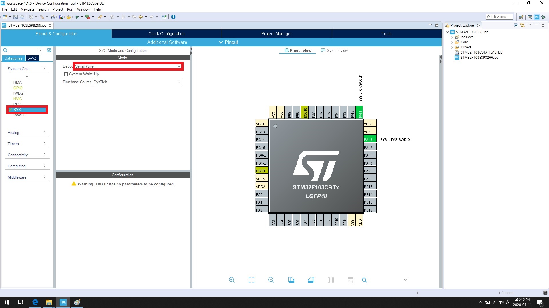 ⑤ 다음 그림과 같이 MCU가 나오면 [System Core]의 하위 메뉴에서 [SYS]를 선택해서 디버깅 방법으로 [Serial Wire]를 선택합니다.