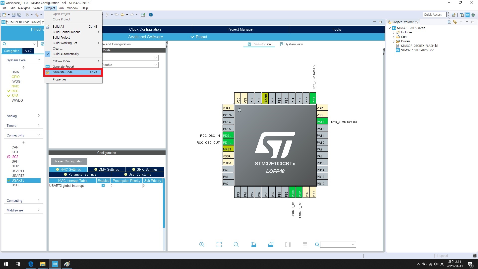 ⑨ [Project] 메뉴에서 [Generate Code]를 클릭하여 코드를 생성합니다. 단순히 소켓 통신을하기 위해서는 특별히 클럭을 따로 설정할 필요가 없어서 클럭 부분은 그냥 넘어갑니다. 소켓 통신 이외에 다른 기기들을 연결하려면 그에 맞게 클럭을 적절히 설정해 주어야 합니다.