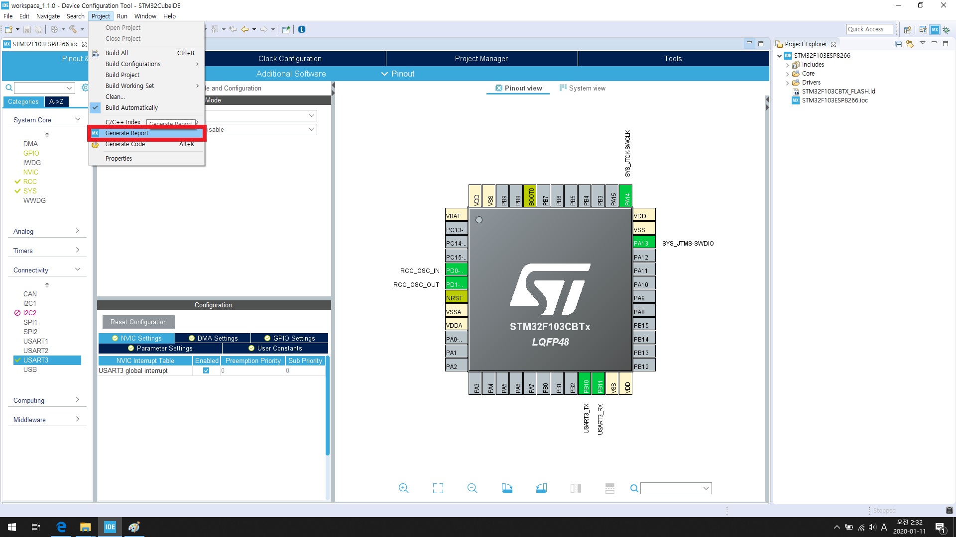 ⑩ [Project] 메뉴에서 [Generate Report]를 클릭하여 참고 자료 파일을 만들어 둡니다. 이 과정은 필수는 아니지만, 나중에 시스템 설정 상태를 간단히 살펴 볼 때에 유익하므로 만들어 두는 것을 권장합니다.