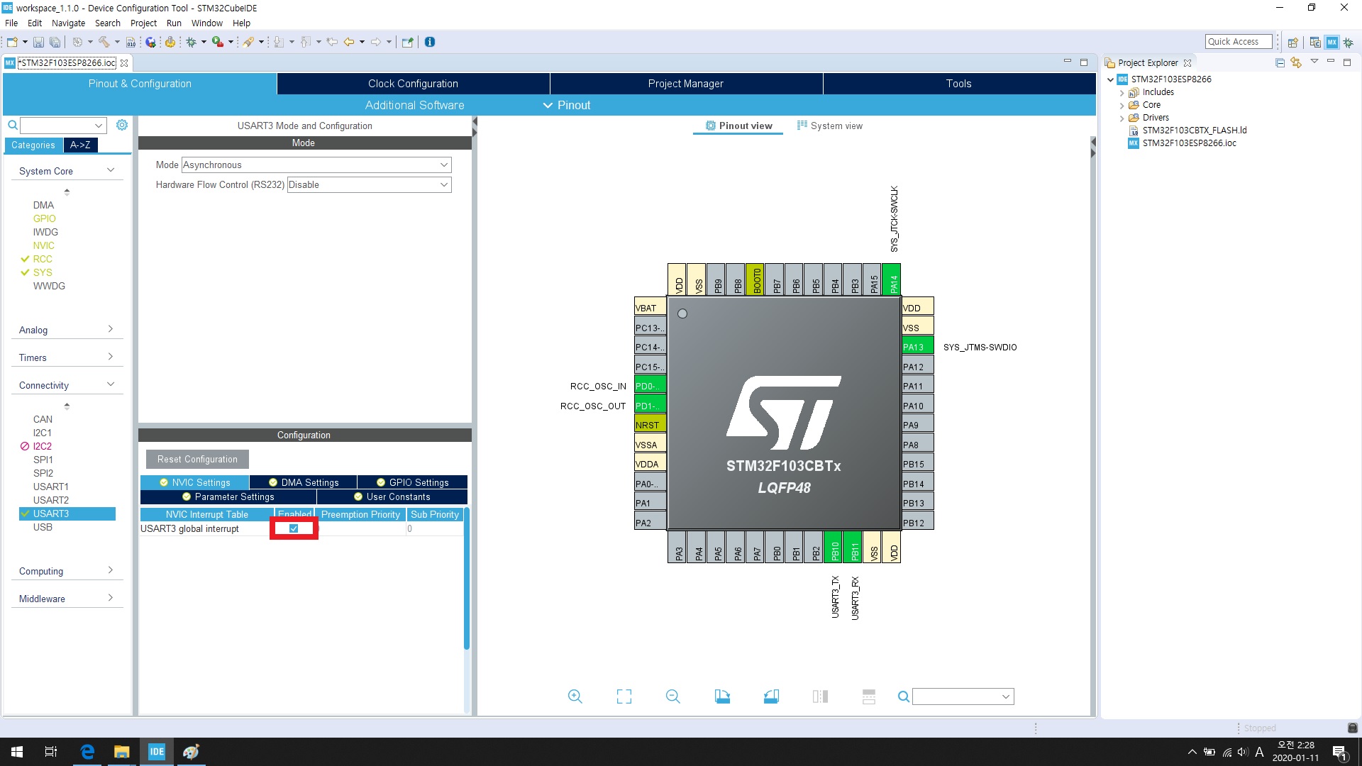 ⑧ ESP8266에서 STM32F103으로 오는 데이터는 인터럽트 방식으로 처리할 것이므로 [NVIC Settings] 항목의 [USART3 global interrupt] Enabled에 체크합니다.