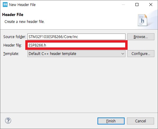 ⑫ 다음 그림에서와 같이 [Project Explorer]의 [Inc]를 오른쪽 바우스 버튼으로 클릭하여 [New], [Header File]을 순서대로 선택한 후에 [ESP8266.h] 파일을 추가합니다.