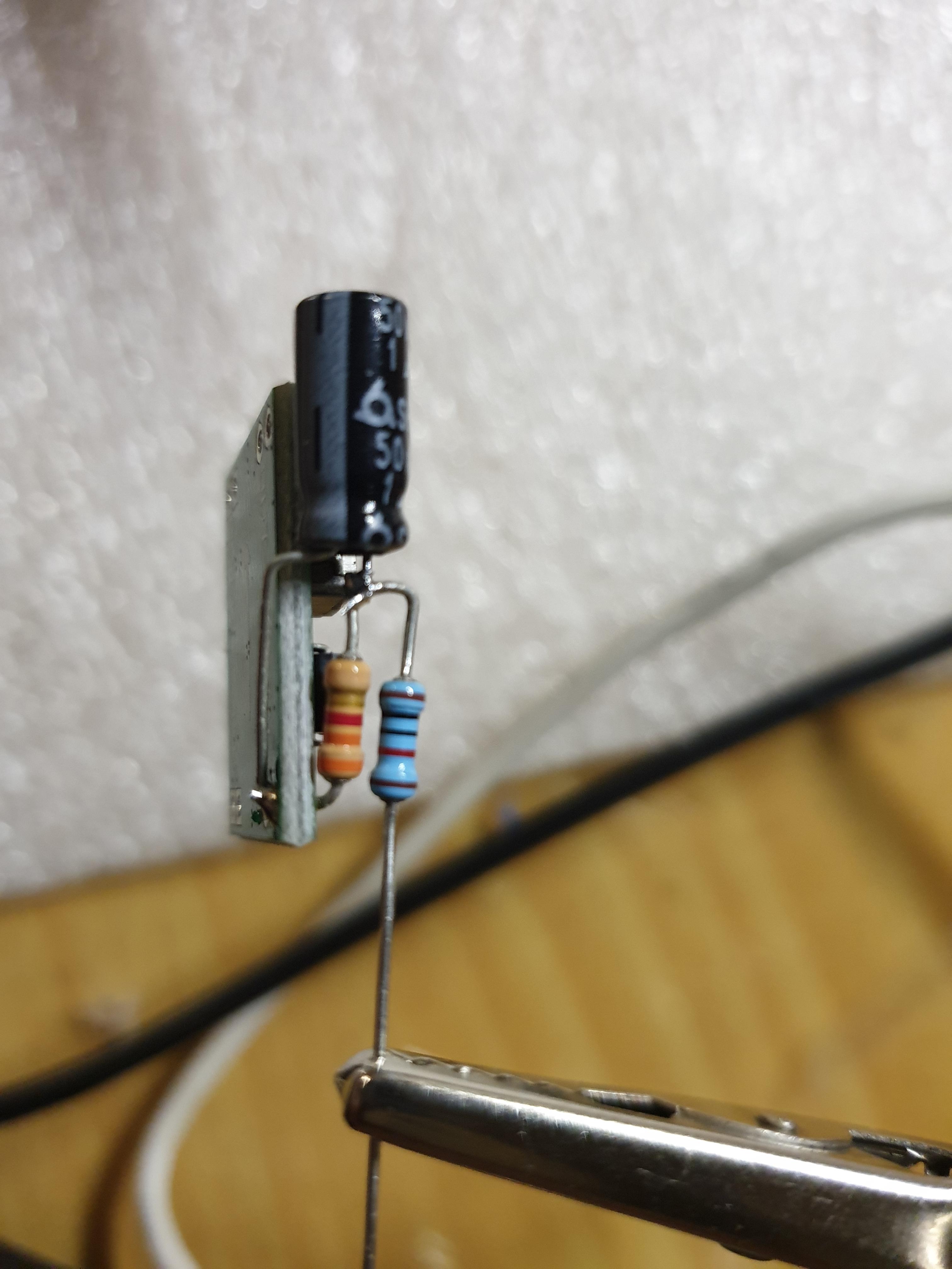 파란색 저항(10k옴)의 집게로 잡고 있는 곳에 ACC 전원을 연결하고, 파란색 저항과 전해 콘덴서를 연결한 곳에 micro USB ID 신호에 연결하면 됩니다. ACC 전압이 12V라면 ID 신호에 약 2.97V가 걸리고, 자동차 전압이 14.4V라면 약 3.57V가 걸립니다. (이 상태에서 주차 감시 모드 메뉴로 진입하는 것에 성공해서 이대로 했습니다만, 나중에 문제가 발생해서 파란색 저항 아래에 있는 3.3k옴 저항을 4.7k옴 저항으로 교체했습니다.)